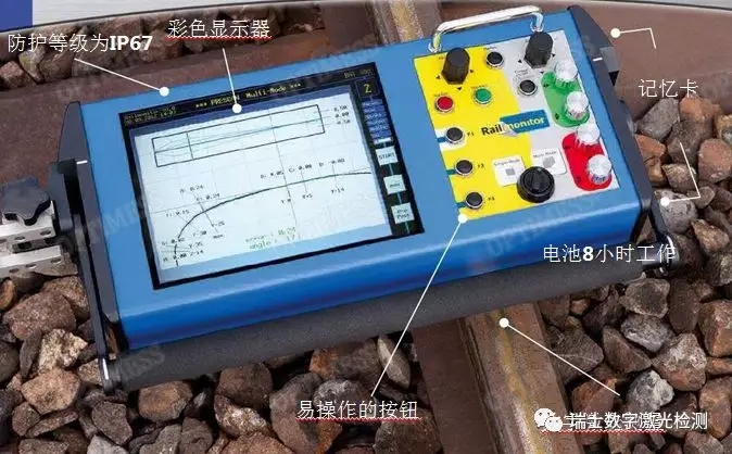 轨检仪采用激光测量原理,具备彩色液晶屏,可同步在线显示出测量结果,并有白天和夜间模式,随时可进行测量。按钮设计的大而灵敏,方便戴手套进行操作。防护等级IP67,防震防摔,并且适用于各种恶劣情况下进行测量,比如高低温、雨天、雪天等。精度达0.05mm,并且操作人,钢轨表面情况均不会影响测量结果。