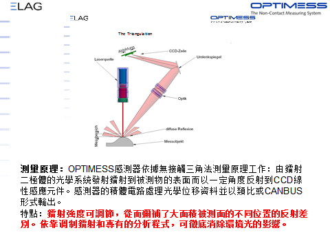 瑞士ELAG Elektronik AG公司致力于非接触激光三角测量系统的研发、生产与应用,拥有30年的实践经验和雄厚的技术力量。ELAG OPTIMESS®高精度,宽频响、大量程,抗强光、防水、防尘和小型智能激光位移传感器,激光扫描仪和2D激光位移传感器,成功地为铁路提供各种测量解决方案:如Railwheel车轮轮对测量系统(便携式,台架式,整车通过式)、铁路综合检测车、接触网测量系统、Railmonitor钢轨测量系统等。