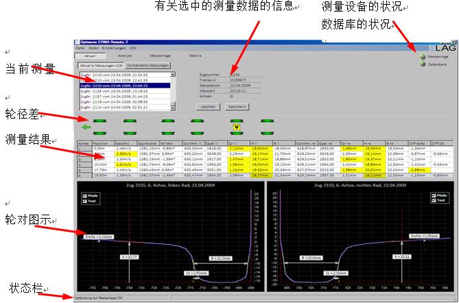 数据库支持的软件可以进一步分析评估轮对踏面和直径测量数据,同时能够管理所有车辆和轮对。除了基本的标准踏面参数外,包括整车、各轴、转向架上轮对踏面参数(轮缘高、轮缘厚度、垂直磨耗Qr)、轮径、轮径差、内测距,还可图示并且显示完整磨耗历史曲线。