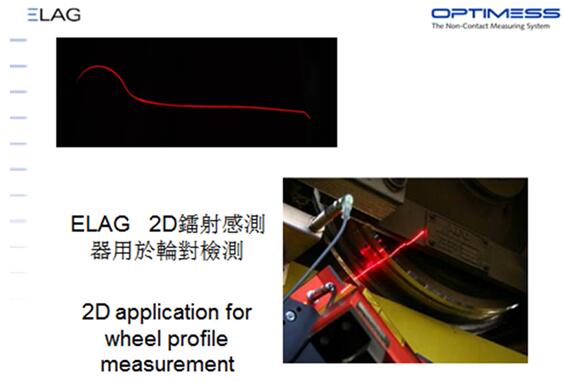 完整的轮对踏面通过2个OPTIMESS 2D二维线性激光传感器进行测量,其中一个2D激光传感器测量自轮对内侧表面到轮缘顶部的踏面,另一个2D激光传感器测量面对钢轨的轮对踏面。通过电脑将这两部分踏面数据合成为完整的踏面参数如SD轮缘厚,SH轮缘高,QR值等。
