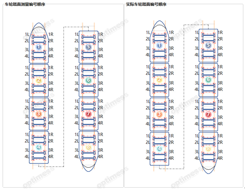 可提供8节编组、16节编组以及1~99节任意编组列车所有车轮踏面外形可视化测量方案,实时显示所有车轮测量状态及分析指标